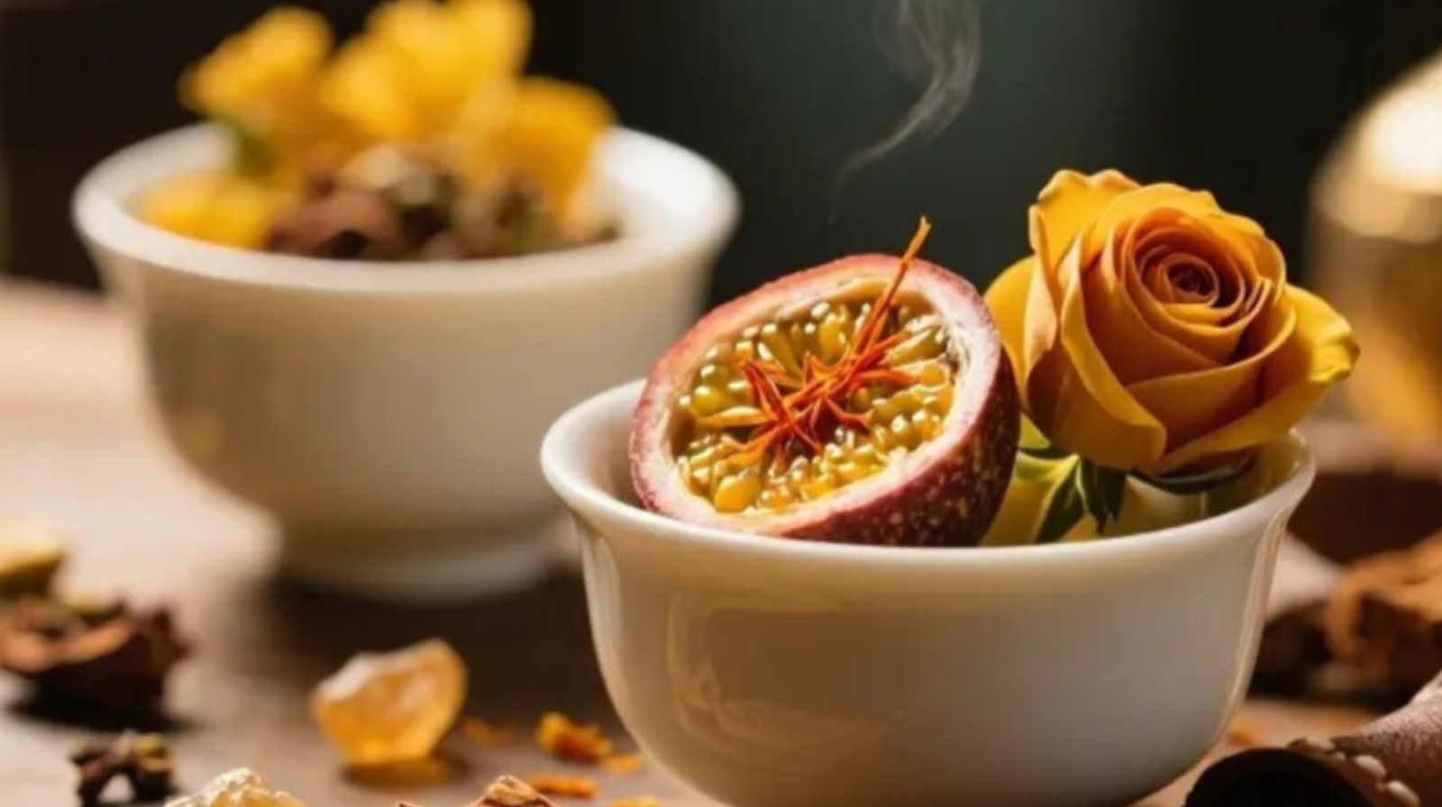 Top: Passionfruit, Fruity notes, Turkish rose, Saffron